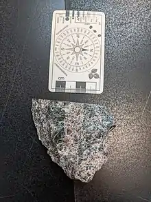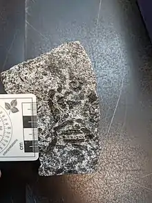 The Farmington Gabbro is postmetamorphic medium to coarse grained plutonic rock next to metagabbros.[2] The unit is surrounded by Proterozoic to early Paleozoic metamorphosed rock.[1] The major and trace elements of the pluton matches the composition of calc-alkaline basaltic magma.[2] The minerals present are plagioclase, hornblende, pyroxenes, olivine, biotite with small amounts of apatite, magnetite, ilmenite, hematite, pyrite, pyrrhotite, and hercynitic spinel.[4][2] The main texture in the gabbro is ophitic to sub-ophitic, but hornblende and plagioclase are subhedral to anhedral grains.[2] Plagioclase is twinned with little zoning.[2] The pyroxene content is mostly clinopyroxene with some orthopyroxene.[2]