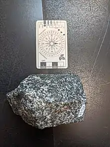 The area of gabbro-diorite intrusions stretches about 720 km long.[6] They are seen as large boulders and on the side of highway 40 NC and highway 158 NC where the hill was cut for the road way.[1] The Mocksville complex consist mostly of metagabbro, but there are outcrops where you can see the contact between the metagabbro rocks and the gabbro (Farmington).[1] The contact could be easily seen because the Farmington Gabbro is the only non-metamorphosed rock unit in this area of plutons so distinguishing between a metagabbro and gabbro may be unchallenging due to the difference in foliation and lineation.[2]