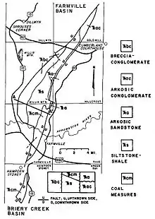 - 1 2 3 Wilkes and, Gerald P. (August 1882). GEOLOGY AND MINERAL RESOURCES OF THE FARMVILLE TRIASSIC BASIN, VIRGINIA (PDF) (Report) (Vol. 28 Num. 3 ed.). Charlottesville, Virginia: Virginia Division of Mineral Resources. Retrieved 2016-08-08.