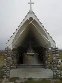 Father DeSmet's Prairie Mass Site, located about one mile east of Daniel, Wyoming, is the site of the first Catholic mass in Wyoming.[2] The mass was conducted on July 5, 1840, by Jesuit missionary Pierre-Jean De Smet. A congregation of 2,000 people, composed of Native Americans, trappers, and traders from the region, attended the service. A stone altar was constructed for the mass and a granite cross enclosed by a small chapel was later added to the altar site. The service was one of the earliest Christian religious ceremonies conducted in the Rocky Mountain region.[3] The Prairie Mass Site lies approximately at the confluence of the Green River and its tributary Horse Creek. A commemorative mass is celebrated on the 2nd Sunday after the 4th in July every year at 10:00 AM MST. Mass is facilitated by the parish Our Lady of Peace located in Pinedale, WY.
