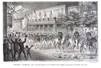 Once the war was over, the return of the few remaining volunteer corps began. The first ones formed a brigade under the command of Faria Rocha, from Bahia, who was received with great effusion by the emperor, making his triumphal march through the Primeiro de Março street, formerly Rua Direita, in the city of Rio de Janeiro.[18]