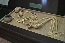 Some three hundred cemeteries have been uncovered from the Fatyanovo culture. The largest of these contain more than a hundred burials. Some shaft graves are more than 2 m deep. The interments are otherwise in accord with Corded Ware practices, with males resting on their right side with their heads oriented towards the southwest, and females resting on their left side with their heads oriented towards the northeast. Grave goods included ornaments of animal teeth, pottery, polished stone battle-axes, and on some occasions stone mace-heads.[5] Fatyanovo burials have been found to include bear claws and pendants of bear teeth. Similar founds have been made in the earlier Sredny Stog culture, Yamnaya culture and Catacomb culture. Some have interpreted this as a sign that the bear had a ritual-symbolic function in the Fatyanovo-Balanovo culture.[12]