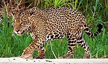 Guyana's rainforests have a wide variety of mammals, the most notable being the Jaguar as it is featured on the coat of arms.[1] Most mammals in Guyana are shared with other countries via the Amazon rainforest. Examples of shared mammals include the three-toed sloth and the capuchin monkey, the latter of which has protection in the form of the Iwokrama Forest Reserve.[7]