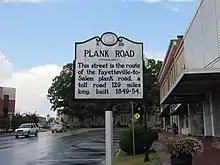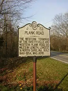 The Fayetteville and Western Plank Road was a 129 mi (208 km) plank road from Fayetteville, NC to the Moravian settlement at Bethania, NC.[1] The road was constructed from 1851-1852 using funds raised by boosters and accompanying funds provided by the state of North Carolina.
