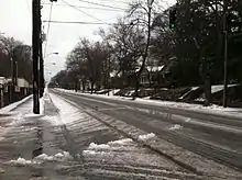 Areas north of the city generally got mostly snow and sleet, while a large swath from the south metro area eastward got the heaviest ice accumulations, though a dry slot at mid-day proved to be much more of a factor in limiting accumulations than had previously been forecast. The worst damages occurred in east Georgia, where over 80% of Augusta was left in the dark, and the Augusta National Golf Club was left littered with branches and other damaged landscaping just a few weeks before the Masters Tournament, in addition to a leaking water tower. The historic Eisenhower Tree, located on the 17th hole of the golf course, suffered irreversible damage and had to be removed.[13] The storm damaged $65 million worth of timber.[14] Further concerning residents was a magnitude 4.1 earthquake two days later, followed by a 3.2 aftershock two days later, at which time most power had been restored, after the storm.