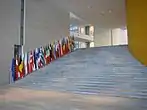 The inner entrance area was artistically shaped by the painter Markus Lüpertz, who transformed the central staircase into six different "colour spaces" whose colours are to symbolise certain classical virtues: blue (wisdom), umbra (as a lion's colour for power and strength), red (valour ), ochre-gold (justice) and green/white (wisdom). In addition, Lüpertz created the sculpture The Philosopher as the epitome of thoughtful people, which is also located in the entrance area. Another large sculpture in the interior can be called the Great White Heading by the artist Rainer Kriester.