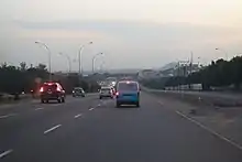 From 1946 till 1960, a significant level of investment was dedicated to the road networks.[1] A new classification designated Trunk A roads as federal roads, Trunk B as regional roads and Trunk C as roads managed by the Native Authorities.[5] After independence, road development was a significant item in the First, Second and Third National Development Plans. Between 1970 and 1980 during the implementation of the Second and Third plans, tremendous investment was diverted to the road sector leading to road standards with posted speeds of 100 kmh more than the previous 56-80 kmh.[4][5] In 1978, the opening of the four lane dual Lagos-Ibadan expressway, marked the first expressway in the country.[6] Improvements were also made in design with carriageway widths of 7.3 meters and shoulder widths on each side at 2.75 meters.[4] The increase in new mileage to roads also brought concerns about building and construction standards of the roads as financing was spread to maximize the number of miles to be constructed. Rehabilitated and constructed roads may not be able to maintain standards with high traffic especially from axle loads on roads lacking weighbridges, causing in degraded pavements.[7][8]