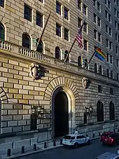 The building was designated a landmark by the LPC on December 21, 1965. It was one of the first landmarks to be designated by the LPC in Manhattan.[2][80][81] The city landmark designation was opposed by the building's owner, the Fed, which wrote that federal property could not be regulated by local governments.[2] The Federal Reserve Building was added to the National Register of Historic Places (NRHP) on May 6, 1980.[1] It is also a contributing property to the Wall Street Historic District,[82] an NRHP district created in 2007.[83]