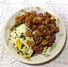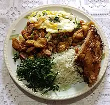 Feijão tropeiro or trooper beans is a Brazilian bean dish typical of the Southeast region, being especially popular in the state of Minas Gerais and considered iconic there. It is made of beans, toasted manioc flour (farinha), and dried meat (usually pork). Usually, feijão tropeiro is served with white rice, fried pork cracklins (torresmo), an egg on the top, and oranges on the side. It is deeply connected to association football and nightlife in the state of Minas Gerais.[1][2]