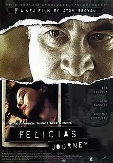 Felicia's Journey is a 1999 psychological thriller film written and directed by Atom Egoyan and starring Elaine Cassidy and Bob Hoskins.[3] It is based on the prize-winning 1994 novel of the same name by William Trevor. It was entered into the 1999 Cannes Film Festival and won four Genie Awards, including Best Adapted Screenplay.