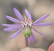 The flower heads are on the short shoots or at the tip of the long shoots, medium-sized, seated or on up to 10 cm (3.9 in) long stalks. The involucre is 6–8 mm (0.24–0.31 in) in diameter, and consists of three to four whorls of bracts. These bracts are overlapping, lance-shaped, hairless, tawny to greenish in colour with the tip often tinged red. They have a papery margin more or less set with a regular row of hairs. The outer bracts are 1½ mm (0.06 in) long and ½ mm (0.02 in) wide, those in the middle 3 mm (0.12 in) long and 1 mm (0.04 in) wide, and the inner 5 mm long and ½ mm wide. Each head has ten to fifteen female, medium or light purple, rarely white, ray florets of about 1 cm long and 1½ mm wide. These surround numerous bisexual yellow, later burgundy-washed disc florets of 4–6 mm (0.16–0.24 in) long. The two style branches each have a long triangular appendage. The pappus bristles are numerous, yellowish white in colour, and do not detach. Although they vary in length, they do not occur in two distinct rows. The longer pappus bristles have teeth along their length and are 5–7 mm (0.2–0.28 in) long, the shorter scaly and ½–1 mm (0.02–0.04 in) long. The dry, one-seeded, indehiscent fruits called cypselae are obovate to elliptic, about 4 mm (0.16 in) long and 1½ mm (0.06 in) wide, evenly silky hairy, with a brownish scaly surface when mature, and a light ochre-coloured marginal ridge.[4]