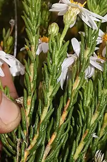 Felicia oleosa is an evergreen, upright, up to 30 cm (12 in) tall, relatively richly branched shrub. The older shoots have lost their leaves. The leaves are set alternately on the stem, overlapping, pointed upward, awl-shaped, up to 7 mm (0.28 in) long and 1 mm (0.039 in) wide, with a broad base, arched below, flat top, bare except for the edge of the leaf base which is fringed with hairs, inside with numerous translucent resin or oil ducts. The leaf axils are barely noticeably hairy.[2]