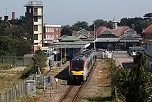 Felixstowe railway station is the eastern passenger terminus of the Felixstowe Branch Line, in the east of England and is the only surviving station serving the coastal town of Felixstowe, Suffolk. It is 15 miles 51 chains (25.2 km) down the line from Ipswich and 84 miles 30 chains (135.8 km) measured from London Liverpool Street; the preceding station on the line is Trimley. Its three-letter station code is FLX.