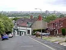 In place of industry came housing. The high density terraced housing which had accompanied the industrial boom of the 19th century had sprawled south and was soon joined by a wave of development at the run of the 20th century.[36] The earlier housing came at Stuart Street, Temple Street and Helmsdale Avenue in the form of Tyneside flats.[37] In the inter-war years, whole derelict industrial areas were cleared and large council estates of semi-detached houses, with front and back gardens, were built at the Old Fold, Stoneygate, Brandling and Nest estates.[36][38] By the time that Felling ceased to be an independent town and was incorporated into the Metropolitan Borough of Gateshead in 1974, Felling had become a "dormitory area" and remains so today.[39]