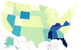 As of 2008, over 5.3 million people in the United States were denied the right to vote due to felony disenfranchisement.[18] In the national elections in 2012, the various state felony disenfranchisement laws together blocked an estimated 5.85 million felons from voting, up from 1.2 million in 1976. This comprised 2.5% of the potential voters in general. The state with the highest number of disenfranchised voters was Florida, with 1.5 million disenfranchised[19] because of a current or previous felony conviction, over 10% of the voting age citizens, including the 774,000 disenfranchised only because of outstanding financial obligations. In October 2020, it was estimated that 5.1 million citizens were disenfranchised for the 2020 presidential election on account of a felony conviction, 1 in 44 citizens.[3]