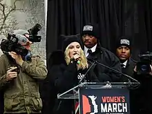 In 2017, during A Year of Yes: Reimagining Feminism at the Brooklyn Museum, Madonna took the stage wearing a shirt with "feminist" (all caps) emblazoned on the front and at one point in her conversation with Marilyn Minter, she vowed to "personally slap" any man in the room that did not identify as a feminist.[125] The same year, commemorating the International Women's Day, she released a 12-minute short film called Her Story and which was dedicated "to all women that fight for freedom" and highlighted the fight for gender equality. The short clip ends with two figures carrying a banner that reads "we should all be feminists".[126] Also, during that year Madonna was one of dozens of celebrities who attended the Women's March in Washington D.C. She sung "Express Yourself" and "Human Nature".[127] In 2018, Madonna proclaimed her solidarity with the Ele Não movement in Brazil,[128] and a year later, in 2019, she talked about the MeToo movement.[129]