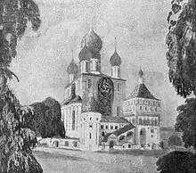 The majolica panel was completely destroyed in Soviet times and had to be recreated.[1] The panel depicts Feodorovskaya Icon of the Mother of God at the top of a symbolical tree of Russian holiness. In the branches of the tree there are the saints: Peter and Alexius of Moscow, Fyodor of Uglich and Joasaph of Belgorod, noble princes Andrey Bogolyubsky and Alexander Nevsky, Tsarevich Dmitry of Uglich, Byzantine saint Michael Malein (patron saint of Tsar Mikhail Fyodorovich Romanov), Sergius of Radonezh, Zosima and Sabbatius of Solovky, Barlaam of Khutyn, Seraphim of Sarov, Euphrosyne of Suzdal and Anna of Kashin. In the lower part of the panel, the figures of Patriarch Filaret and his son, Tsar Mikhail Fedorovich Romanov, rise above the walls of the Ipatievsky Monastery in Kostroma.