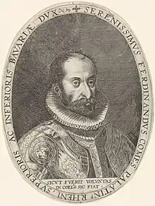 Ferdinand of Bavaria was born 20 January 1550, in Landshut, in the Duchy of Bavaria, and died 30 January 1608 in Munich, at the age of 58. He was the second surviving son of Albert V, Duke of Bavaria, and his wife Archduchess Anna of Austria, and consequently was prepared for a military career. Ferdinand is also known for the two extraordinary diaries he kept, one as fifteen-year-old boy on a journey from Munich to Florence, for his aunt's wedding, and a second journey to Florence, this time as young and experienced man of affairs.