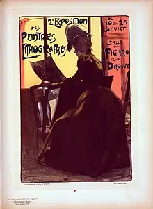 Gottlob's 1900 poster for the 2nd Exposition of Painter-Lithographers on the Rue Drouot in Paris shows a strong influence of Henri de Toulouse-Lautrec in its composition.[6] A woman is in front of a large illuminated window, and the dramatic back-lighting emphasizes the dark forms of her dress and hat.[7] He created relatively few posters in his life, but this exposition of posters was one in which he participated.[8] In addition to lithographs and portraits, he painted cityscapes of Paris and landscapes of Normandy and Brittany.[5]