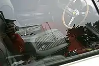 Pininfarina created the bodies in aluminium, over a mid-engine competition chassis. The most unusual feature was the triple seating with the driver situated in the center, slightly forward, with the other two seats slightly back. The center-mount windshield wiper was carried from the donor race car. New were the luxury additions like leather seats, carpets, chrome bumpers and fittings.[5] The overall shape was very similar to both the Dino Berlinetta Speciale and more so to the Dino Berlinetta GT, the final prototype before the production variant. Apart from the seating arrangement, also the overall dimensions and shape were altered to accommodate a bigger V12 powerplant. The Ferrari Berlinetta Speciale was also known as "Tre-Posti" for its unique seating design.[8]