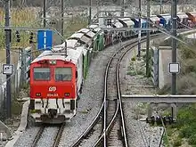 FGC locomotive 254.03 hauling freight cars near Sant Boi