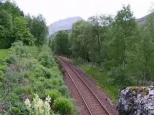 The West Highland Railway opened the line to passengers on 7 August 1894; later it was operated by the North British Railway, until in 1923 it became part of the London and North Eastern Railway. In 1948 the line became part of the Scottish Region of British Railways following nationalisation. Fersit Halt however was opened to serve the navvy encampment and the construction depot for the Lochaber Power Scheme that involved extensive works building dams at Loch Treig and Loch Laggan.[3] A diversion of the original West Highland Railway line route was necessary over a distance of [4] 1.5 miles, the original trackbed is visible beneath the Loch Treig dam.[5]