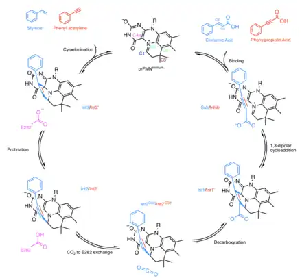 8. 1 2 3 Bailey SS, Payne KA, Saaret A, Marshall SA, Gostimskaya I, Kosov I, et al. (November 2019). "Enzymatic control of cycloadduct conformation ensures reversible 1,3-dipolar cycloaddition in a prFMN-dependent decarboxylase". Nature Chemistry. 11 (11): 1049–1057. Bibcode:2019NatCh..11.1049B. doi:10.1038/s41557-019-0324-8. PMC 6817360. PMID 31527849.