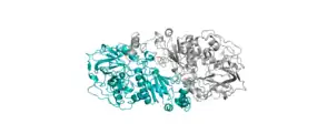 Ferulic acid decarboxylases (Fdc) are decarboxylase enzymes capable of the reversible decarboxylation of aromatic carboxylic acids such as ferulic acid and cinnamic acid.[1] Fdc's are fungal homologues of the E.coli UbiD enzyme [2] which is involved in ubiquinone biosynthesis.[3] This places Fdc within the wider UbiD enzyme family, representing a distinct clade within the family [2] Presence of fdc1 and the associated pad1 genes (Pad1 homologous to UbiX in E.coli) were shown to be required for the decarboxylation of phenylacrylic acids in Saccharomyces cerevisiae.[4]