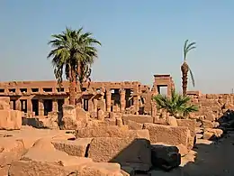 Built at the eastern end of Karnak's main axis, and enclosed in its own walls, this building is little understood and its exact purpose is still unclear.[2] It consists of three main parts, a suite of rooms dedicated to Sokar to the south-east, a solar complex to the north-east and the festival hall itself, from which the other areas of the building can be reached. This is known as the 'Hry-ib', or that which is at the heart of it.[3] The only original entrance was in the south-west corner. The walls contain the Botanical garden of Thutmosis III.