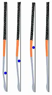 Using extreme examples is useful as a means of demonstrating effects that occur in less extreme configurations but are much more difficult to spot and therefore to explain. The first observation is an easy one (top left in the image captioned "Reversed head in various…"). If the stick head is rotated onto the reverse (lighter colour) the toe is not going to disappear into the ground to enable the reverse side of the stick to be presented to the ball—a vertical adjustment is necessary. Secondly (top right), if the handle of the stick is kept at exactly the same angle and rotated, a horizontal adjustment is necessary to bring the reversed head to a position where contact will be made with the ball. The third figure (bottom left) shows these adjustments having been made (and a change to the angle of the handle because the position of the hand holding the stick at the top would be about the same as it is when gripping the stick in the forehand position), but the area of stick head making contact with the ball is very small; so control may not be adequate. The fourth figure (bottom right) demonstrates that to get good contact with the ball on a larger area of the reversed head, it is necessary to move the handle much nearer to the vertical. This means the player must bring the ball in very close to the feet and come to a more upright dribbling position—this in turn impairs the ability to scan the pitch and keep the ball in peripheral vision at the same time—a considerable disadvantage when dribbling to evade opponents.