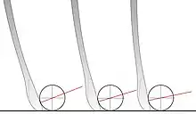 A hockey stick is occasionally used in the vertical position shown, but manipulating the movement and the direction of the ball in a controlled way (dribbling) is carried out in what is termed a "dribbling crouch", when the handle of the stick will usually be angled between 35° and 55°. Hitting or pushing the ball can be done with the stick at any angle between the vertical and horizontal and recent changes to the rules allow even the edges of the stick to be used to sweep or strike at the ball on the ground. The various stick head designs can be compared in respect of how, with the handle at an angle of 45°, they differ in the carrying out of the Indian dribble, i.e. controlling the direction of the ball by rotating the stick head over the top/front of the ball rather than (or as well as) around the back of the ball (the English style dribble). The multi-layered stick head diagram indicates the changes in head shape and length that occurred over thirty years or so.