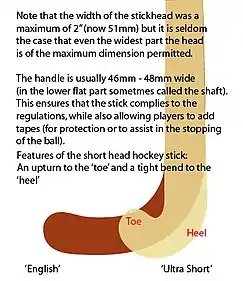 Some players were cutting part of the toe off their sticks, to achieve a shorter head, and rounding the end off, (although on the older styles this did nothing to tighten the bend to the heel and often just ruined the stick). Predictably, there were sticks produced for the 1986 World Cup with heads with a horizontal length of only 95 mm. The international players to whom they were handed out tried them and then returned them as unusable.