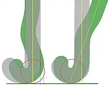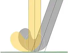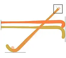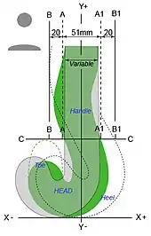 The extent of the stick head along the X+ axis, towards the 'heel' of the Head is confined by the rule requirement that the stick head and the handle meet in a smooth continuous fashion at the line C-C and by a rule restriction on the shape of the handle, which is that the stick-handle must not project beyond the line B1-B1. It is possible to envisage a stick where the width of handle did not extend beyond the line A1-A1, thus allowing a significant extension of the stick head along the X+ axis, but the practicalities of such a design seem to be limited and have not been explored. The length of the Head (or toe) along the X- axis has varied enormously, especially since the Second World War and again after the introduction of the timber lamination process in the early 1980s.