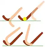 It is also necessary to avoid unintentionally turning the handle during a hit at the ball so that the ball is "sliced" (to the right) or hooked (to the left), this is achieved by gripping the stick firmly, generally with one hand locked against the other at the top of the handle, at the moment of impact with the ball.