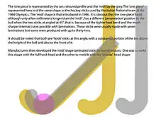 Gradually over many years stick heads were made shorter and the "heel" was made to a tighter bend. This process continued until the "one piece" head could not be made to a sharper bend without the timber splitting out on the base. As it was, attempts to have the grain follow entirely the same curve as the bend, as it should for maximum strength (this is why the timber is bent rather than cut to shape) were abandoned by some producers and an upturn to the toe was sometimes achieved by cutting across the wood-grain at the toe end of the head to achieve the desired shape. Some manufacturers resorted to gluing a separate piece of wood on top of the toe or glued additional strips of timber to the inner edge of the handle above the head to get the effect of a tighter heel bend. ("Head adjustment" frequently happened to update old style stock or where unmodified presses were in use.).