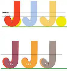 The sample diagram on the right shows three deviating areas (a), (b), and (c). Any of these areas could exist on a stick by itself but, in this illustration, area (a) could legally coexist with area (b) and area (c) could coexist with area (b); but areas (a) and (c) could not legally coexist on the same stick because they are both on the same edge and only one protrusion either beyond the line AA or beyond the line A1A1—or both—is permitted on the handle.