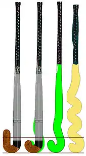 The early extremes in stick design were in those sticks intended for use by goalkeepers. The aim was simply to present the maximum stopping area to the ball. The first was the extended hook (far left), which was made with a toe of approximately 150 mm (6 in). When sticks with an upturn substantially more than that (some more than half the length of the handle) began to appear, which was around 1988, the FIH placed a limit of 100 mm (4") on the upturn of the toe of the head.