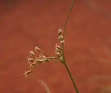 The annual or perennial plant, 10โ80 cm tall, with numerous long stems about 2 mm in diameter, slightly three-angled, compressed below the inflorescence, node-less, smooth and has a tufted habit. The root system is fibrous, wiry, black. Short rhizomes. Leaves numerous, forming a dense tuft at the base of the stem, being at least half as long as the stem.[3]