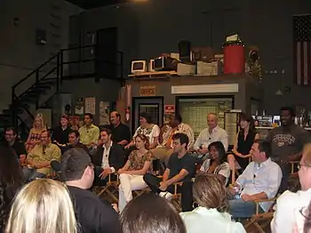 Many members of the show's crew made cameos in the episode. The documentary crewman's voice that speaks to Dwight was played by camera operator Matt Sohn. The "frat boy" who mocks Andy at the restaurant was Greg Daniels' former assistant, Jonah Platt. Jay Falk, a script editor for the series, and his wife stood in for the couple buying Jim and Pam's house.[20] Jennifer Celotta, a series writer and director, makes an appearance at Dwight's wedding. The episode's call sheet listed her character as "Jen Celotta Schrute".[21] Producer and writer Graham Wagner also makes a cameo in both Mose's group, as well as at the wedding.[20] Many of the individuals who asked questions were writers on the show: Brent Forrester asked about seeing their lives on TV, Amelie Gillette asked the question regarding Jim giving up Athlead, Steve Burgess asked if the camera changed the characters' behavior, Steve Hely asked if life has no meaning, Allison Silverman made the statement that Jim is attractive, and Dan Sterling asked what was in the teapot. Daniels' wife, Susanne Daniels, was the Q&A moderator.[20][22] Daniels himself appeared during the documentary after-party along with executive producer Howard Klein, editors David Rogers and Claire Scanlon, script supervisor Veda Semarne, first assistant director Rusty Mahmood, prop master Phil Shea, and casting director Allison Jones. The remaining extras in the scene were members of the crew of The Office.[19][20]