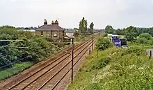 The signal box, which had 18 levers for points and signals, was situated at the south end of the down platform more or less opposite the main station building which was just to the north of the goods shed. There was a small brick built shelter on the down side for Norwich bound passengers.[4][5]