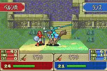 Battles take place on grid-based self-contained maps and are governed by a turn-based system where units on both sides are given their chance to move and act. Once a unit has moved, depending on their position relative to allied units and enemies, they may perform actions such as attacking or supporting allied characters through statistic-enhancing abilities, or they can wait until the next turn. When attacking, the game transitions from the top-down view of the map to a side-view battlefield, where a cinematic battle plays between the player and enemy units. Each unit has access to different weapons and items, but these will break after a number of uses and must be repaired in between missions. The effectiveness of melee weapons is dictated with the series' recurring Weapons Triangle mechanic: axes are strong against lances, lances are strong against swords, and swords are strong against axes.[5][6][8][9] Villages found during map battles will be attacked; if defended by the player, non-player characters within the village will give hints about future objectives or provide a reward. A map is cleared when the boss is defeated and Roy seizes the boss's location.[5] If characters fall in battle, they are subjected to permanent death, removing them from the rest of the game. If Roy dies, the game ends and the map must be restarted.[5][8]