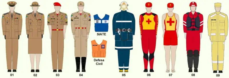 The Firefighters Corps of Paraná wear the same uniforms of the Military Police of Paraná, just adding their badges and insignias.