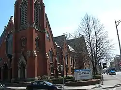 The First Baptist Church is an historic American Baptist church located at 164 South Cherry Street in Poughkeepsie, Dutchess County, New York. It was built between 1875 and 1877, and consists of a rectangular main church section, front entry pavilion, and tall rectangular bell tower. The brick building features Gothic arched openings and stone tracery.[2]
