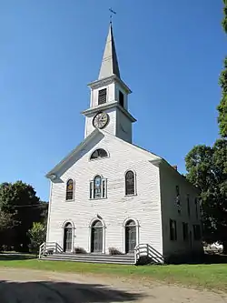 This structure was built in 1803, and is the town's oldest church building. Originally located at Harrington and Parsonage Hill roads, it was moved to its present location in 1818. It was originally built in the style of a colonial meeting house, with square pews and a gallery; the pews were removed during alterations in 1845–46, at which time the gallery level was built over into a second story. The building's Federal styling appears to have been inspired by the publications of Asher Benjamin, a resident of nearby Windsor, Vermont.[2]