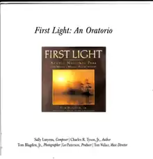 First Light: An Oratorio is a 2005 oratorio by composer Sally Lutyens. The words are from the book First Light: Acadia National Park and Maine's Mount Desert Island, by Charles R. Tyson, Jr. It was composed with the intention of being a multimedia performance to be shown with photographs by Tom Blagden, Jr. It was first performed at St Saviour's Church in Bar Harbor, Maine on 27 and 28 August 2005.[1] This performance was recorded and sold as CDs, and as DVDs, which included the slideshow.
