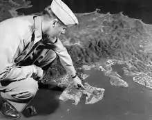 After conducting extensive research on the topography of Japan, an 80-by-60-foot (24 m × 18 m) scale model (1 foot: 1 mile) of target areas was fabricated complete with mountains, buildings, railroads and the rice paddies. It also depicted clouds and fog. The films were produced using a specially mounted overhead camera. The camera was motorized and could be moved to simulate an airplane's flight over the model. According to the New York Sun, "the camera recorded what the crew of a B-29 would see from 30,000 feet."[15] Using the films, pilots of the 20th Air Force easily found their targets and were amazed at the level of detail and the accuracy that the unit was able to produce.[9] General Arnold said the following of the units accomplishment: "there never has been anything quite so good as this for briefing men on dangerous missions."[15]