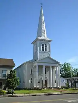 First Presbyterian Church of Le Roy is a historic Presbyterian church located at Le Roy, Genesee County, New York. The church was built about 1825–1826, in the traditional meeting house style and consisted of a gable-roofed main block with a bell tower and an engaged center pavilion. It was later renovated in the Italianate style in 1866. Additions were made to the original building in 1898–1899, 1913, and 1951 and, between about 1929 and 1951, the current Roman Doric portico was added. The 1913 Sunday School addition designed by Claude Bragdon, the portico, and the 1951 Elizabeth Allen Olmsted Memorial Hall are in the Colonial Revival style. Also on the property is the contributing former manse; a two-story Queen Anne-style brick building built about 1880.[2]: 3, 15