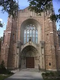 The church and the Palmer Hall education building to its left were dedicated Easter Sunday, April 9, 1939. An addition to connect the education building to the rear of the sanctuary was dedicated December 15, 1985. The Gothic style buildings built of brick with limestone trim, designed by Douglas Freret, sit on an entire square, bounded by Octavia, Jefferson, South Prieur Streets and South Claiborne Avenue.[2] In the later part of the 20th century, First Presbyterian was successfully racially integrated by South African medical students working at nearby Tulane University, under the leadership of Dr. Wil MacIntosh, a first generation Scotsman, a civil rights proponent and a champion of inter-denominationalism.