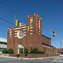 First Reformed Church, also known as the First Reformed United Church of Christ, is a historic Reformed church located at 22 E. Center Street in Lexington, Davidson County, North Carolina. It was designed by architect Herbert B. Hunter and built in 1927–1928. It is a steel frame building sheathed in tapestry brick, with a Late Gothic Revival style interior. It features a pair of corner towers of uneven height, pointed-arched portal, and a stone and stained glass rose window.[2]