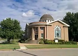 The church was built in 1917 at a cost of $15,000. Handmade bricks from local clay were used, and members of the church congregation volunteered to work on the building.[2] It is the only building in Cotton County, Oklahoma that includes major elements of the Romanesque Revival style and incorporates a large dome at its center.[2] According to the national register submission form, it is the best example of this architecture style in southwestern Oklahoma.[2] It was added to the National Register in 1983. The layout of the school area follows the Akron Plan.[2]